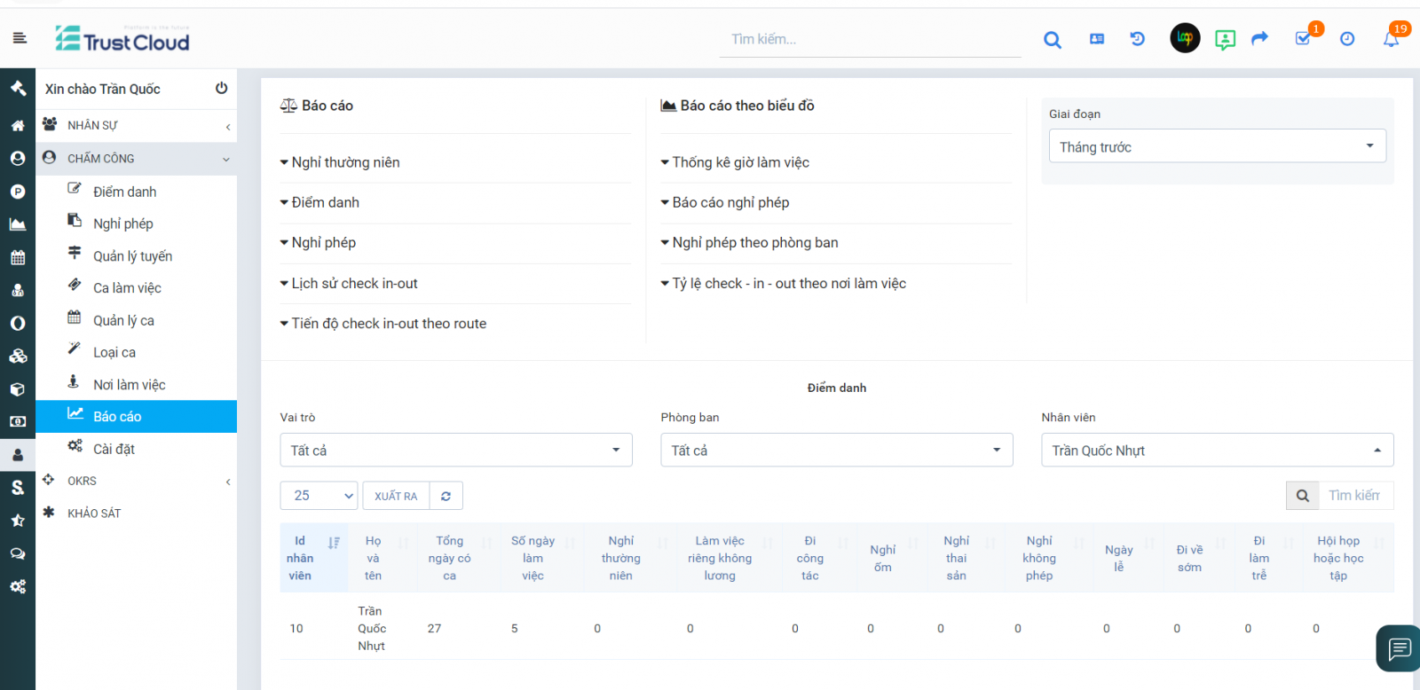 Báo cáo theo tháng hoặc khoảng thời gian.